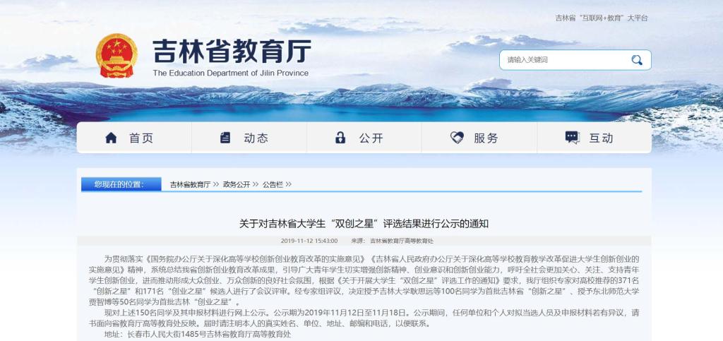 11月12日,吉林省教育厅网站发布了《关于对吉林省老员工“双创之星”评选结果进行公示的通知》。根据《关于开展老员工“双创之星”评选工作的通知》要求,对我省高校推荐的371名“创新之星”和171名“创业之星”候选人进行了会议评审。经专家组评议,决定授予100名同学为首批吉林省“创新之星”、授予50名同学为首批吉林“创业之星”。